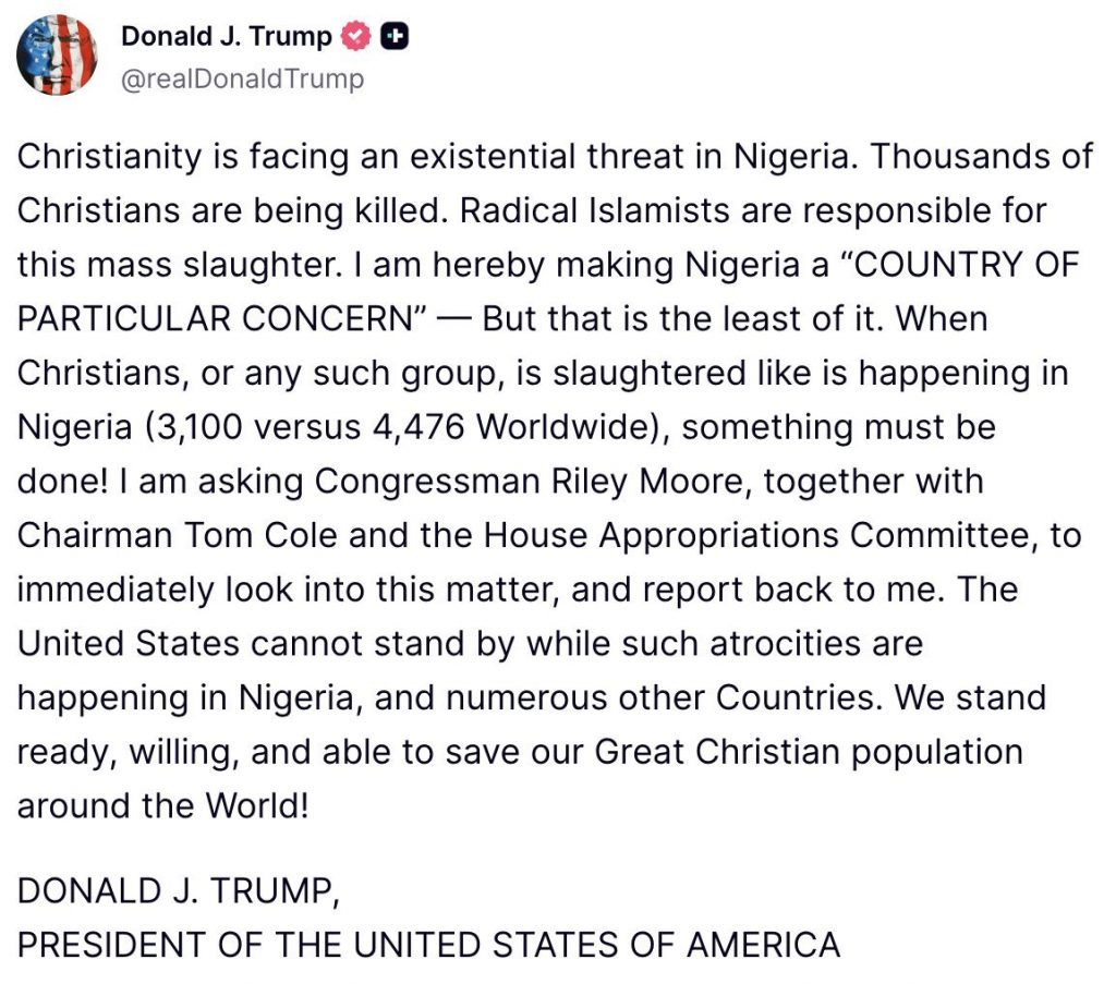 Trump’s comments come amid years of violent attacks across Nigeria, where militant groups like Boko Haram and Islamic State–West Africa Province have targeted Christian communities. Thousands have been killed or displaced in the country’s Middle Belt and northern regions. Christian advocacy groups have urged world leaders to act, accusing the Nigerian government of failing to protect its citizens. Trump’s tough rhetoric marks one of the strongest responses yet from a major Western figure, echoing calls from conservative and religious organizations that have long criticized Washington’s silence on the issue.